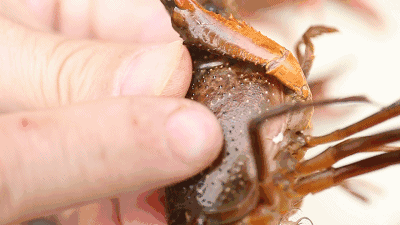 2、捏住小龙虾的头部,剪掉小龙虾两边的须。