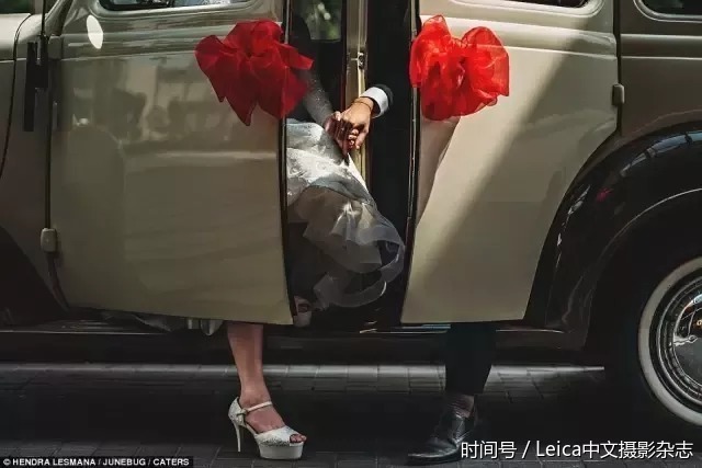 Qpmq@iL 在这张亲密的照片里,这对新人在抵达婚宴现场时将自己最美的脚从车上伸出来。