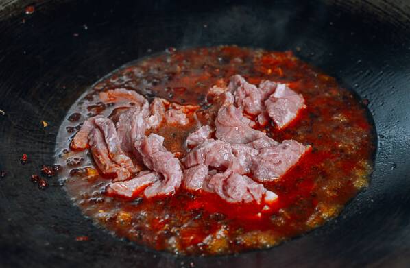 7.放入处理好的牛肉,沸腾时搅拌,直到牛肉变色