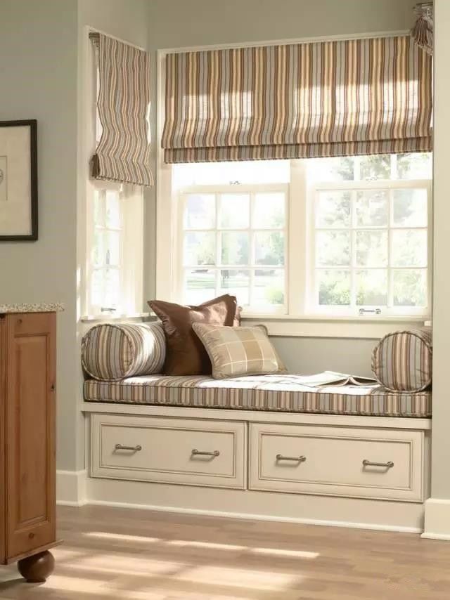 在底部设计成抽屉式收纳柜,是我们最常见的飘窗形式。