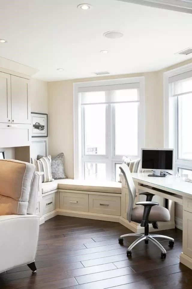 飘窗在很大程度上增加了空间的采光和通风程度,还多了些许小情调,如果你想创造一个轻松自由的办公/学习氛围,不妨将飘窗改造成书台。