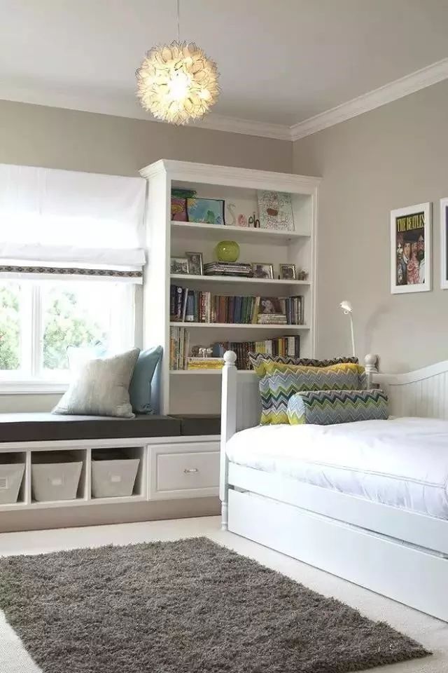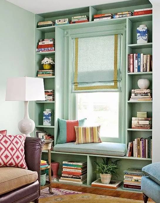 根据飘窗的高度,在其两边打上边柜,设计成一个书架,就能让飘窗成为整个空间的视觉焦点。