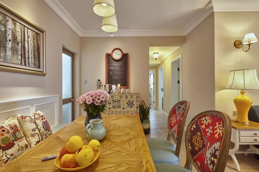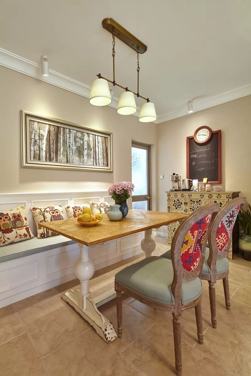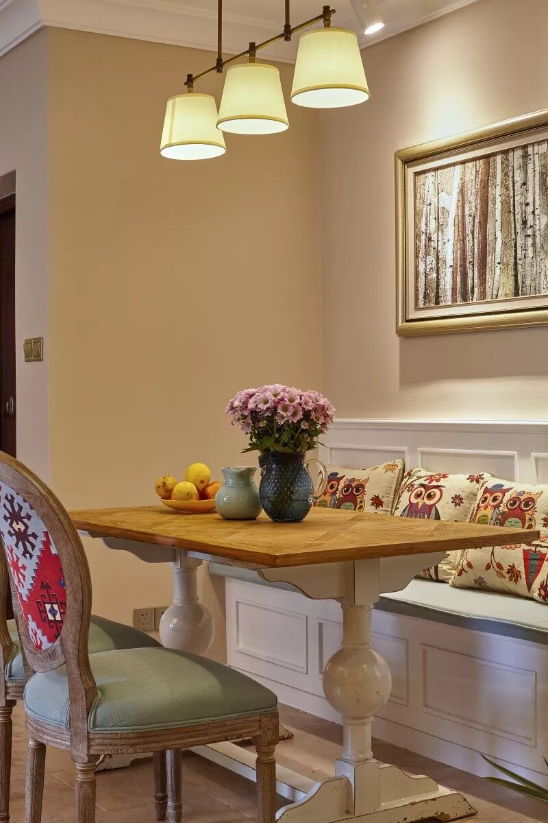 ▲白色卡座式的座椅为餐厅节省了不少的空间,座椅上卡通色彩的抱枕与木制的餐椅背面色彩相呼应,在吊灯的灯光下,整个用餐区瞬间灵动起来。