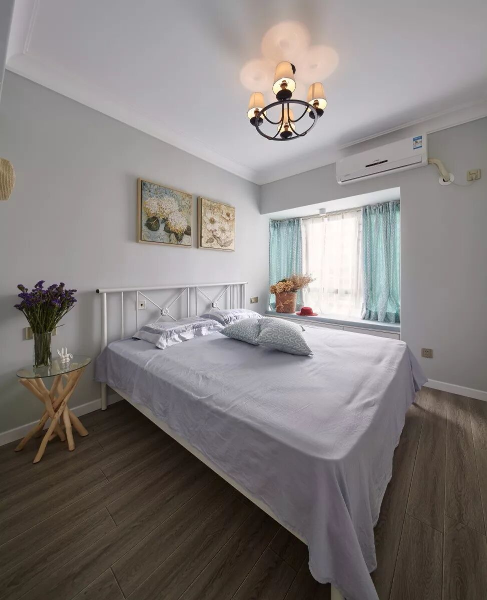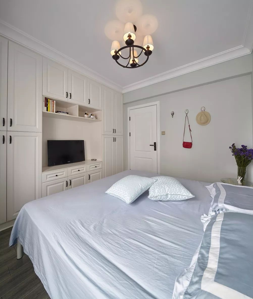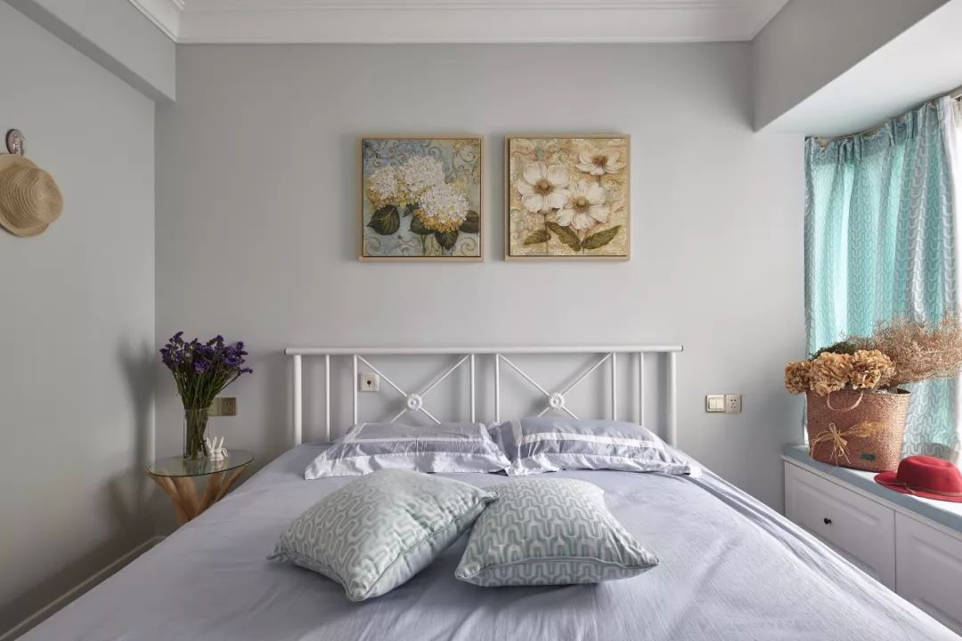 ▲主卧以冷色调为主基调,干净素雅,与客厅的暖色调形成鲜明的反差的对比。