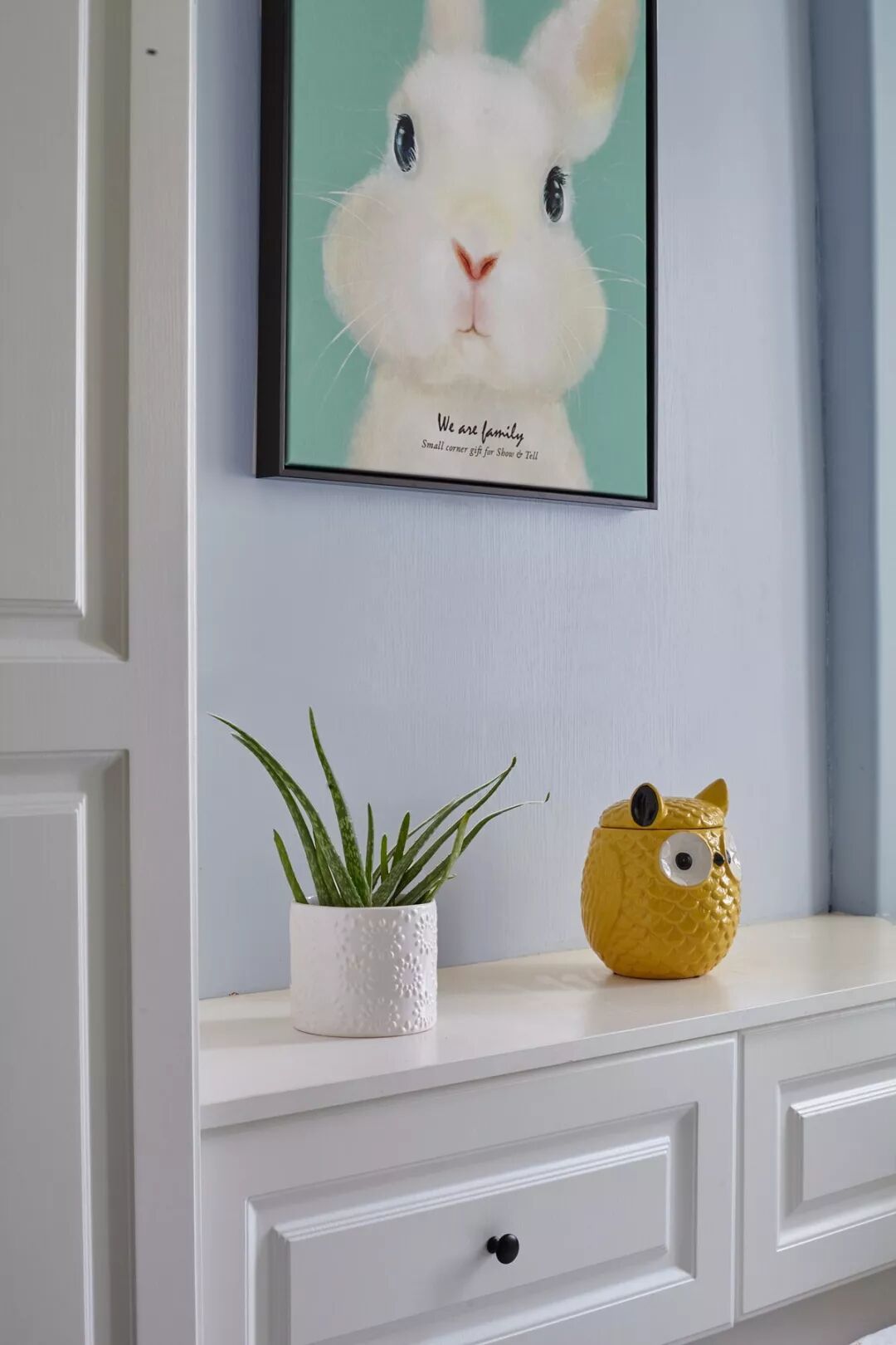 ▲卡通兔子的墙壁挂画、黄色卡通的猫头鹰储物罐,为小主人增添了一笔童趣的色彩;学习桌上摆放的小禾苗盆栽,更为整个儿童房增添了一笔生机活力,也益于小主人的身心健康。