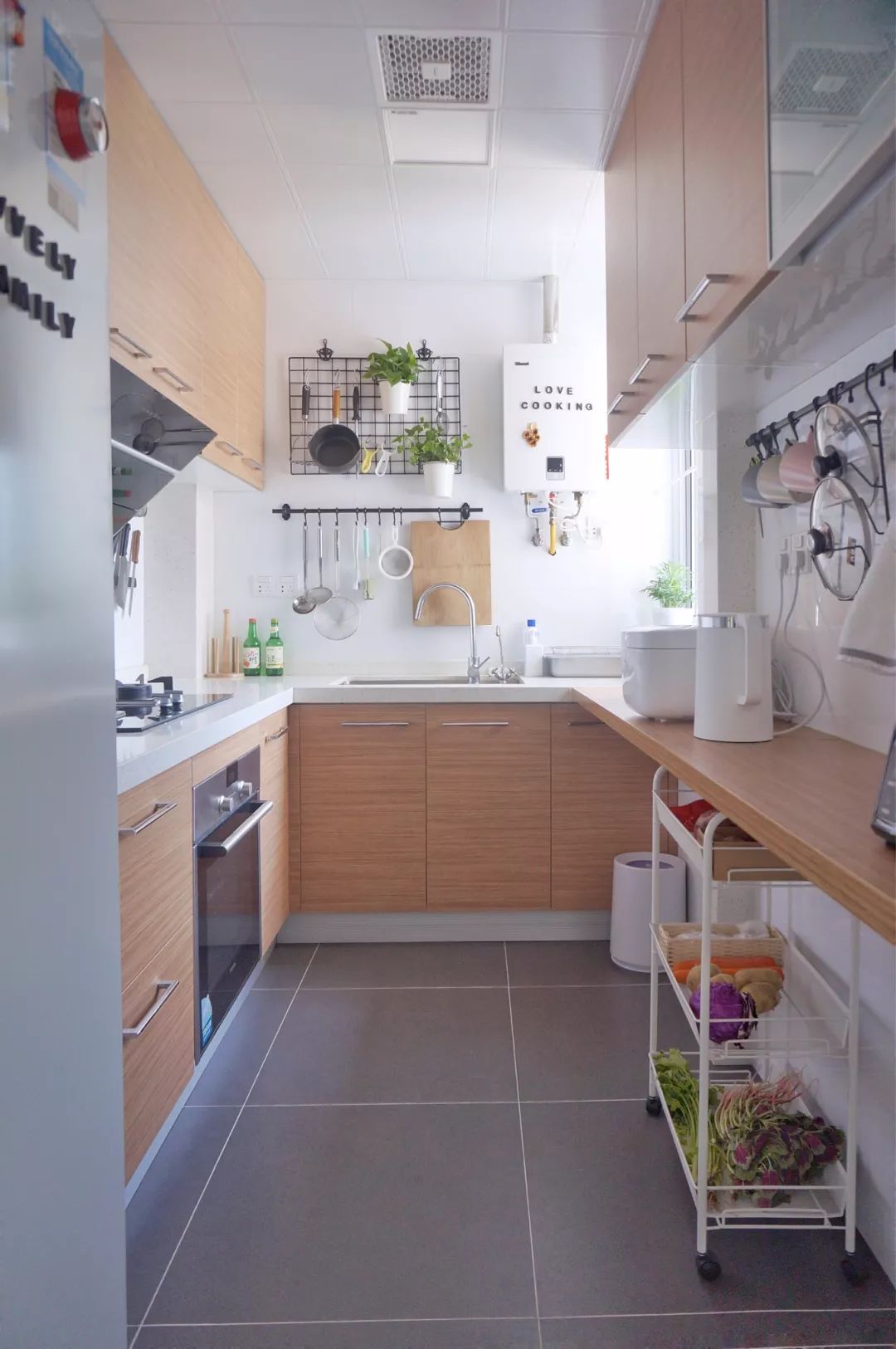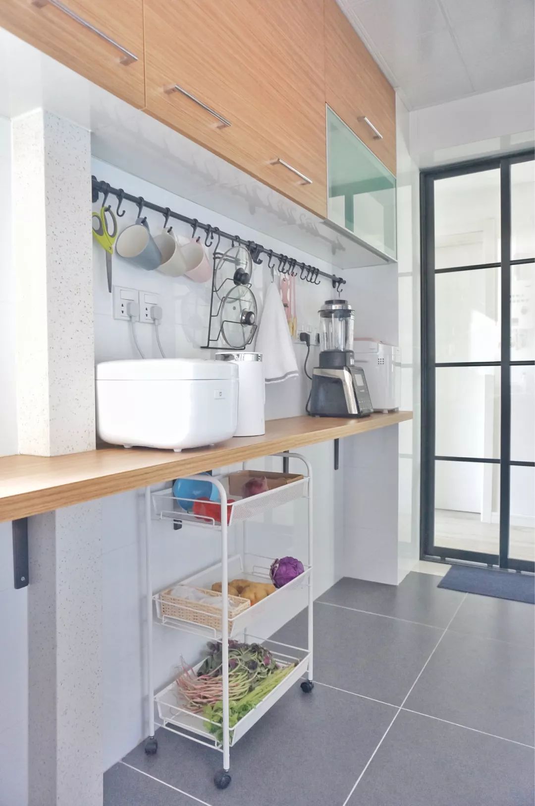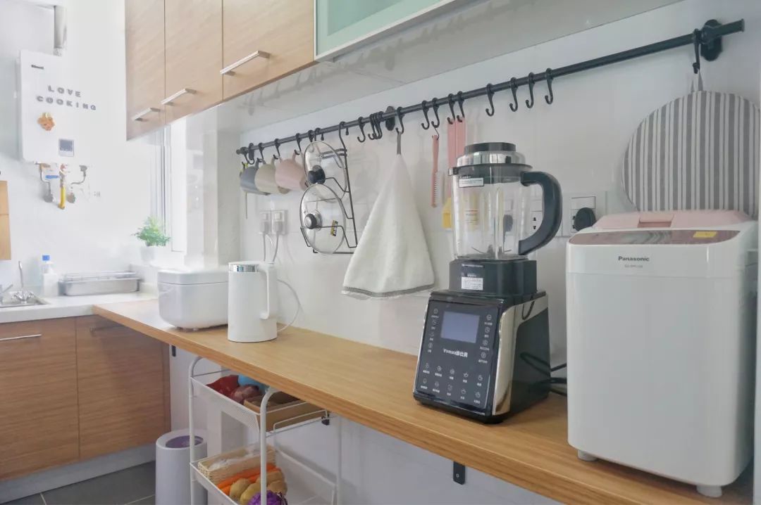 可移动的白色的操作台架,方便放置平时食用的蔬菜食材,便于烹饪时的取放,为女主人的烹饪提供了极大的方便。
