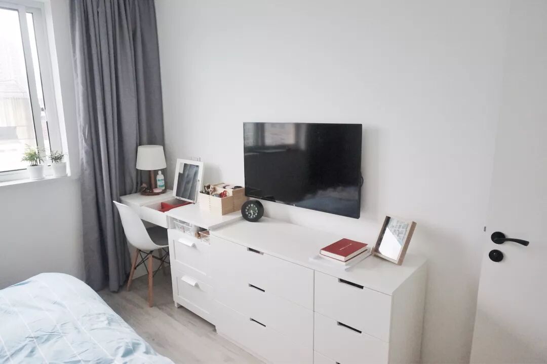 床尾位置将电视挂置在墙上的方式为下白色的储物柜节省了占地空间,左侧白色小书桌上的白色台灯,当主人夜晚阅读书写时,默默地守在身边,点亮一盏明灯。