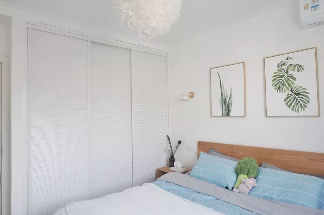 白色的主调卧室,床头背景墙搭配上的植物挂画,带着淡淡小文艺的清新感。