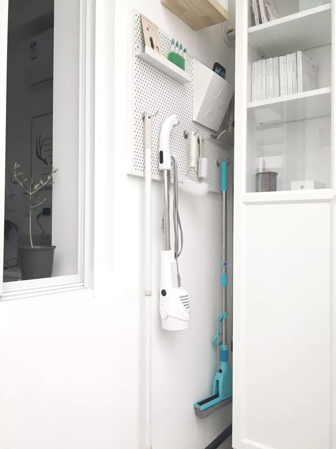 墙上用洞洞板的设计方式,用来挂置拖把、吸尘器等打扫工具,节省了大量的占地空间。