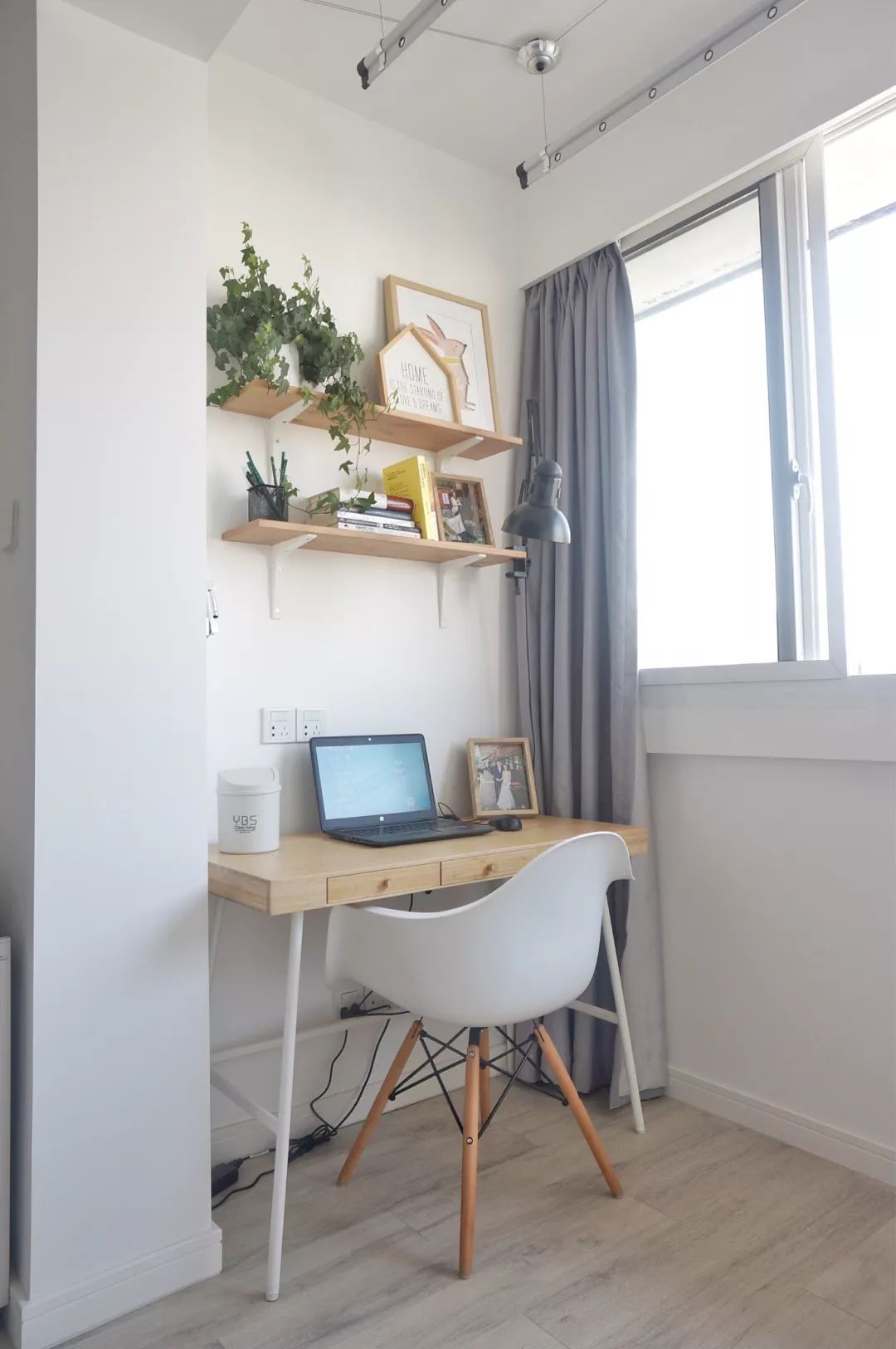 木制的电脑桌与白色的伊姆斯木脚椅,简单而又舒适的工作区。