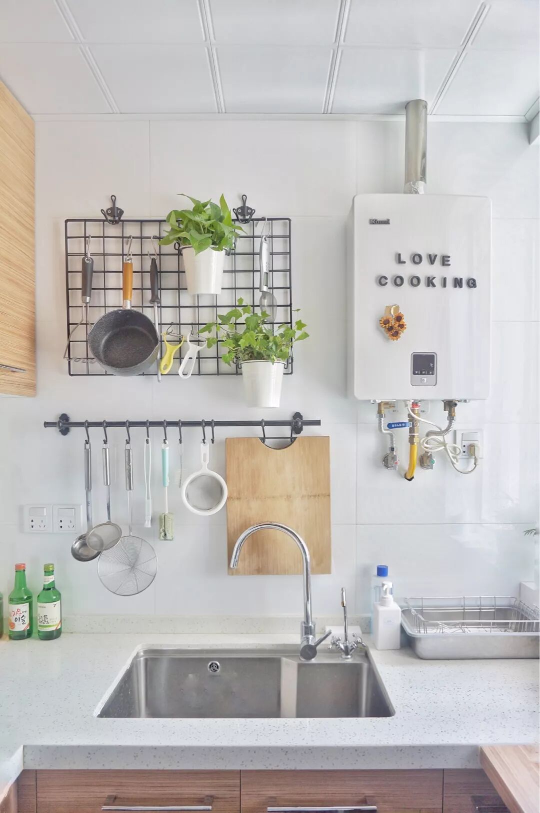用黑色的挂钩用来收纳厨房里的各种杂物,搭配上白色墙面,保证了操作台的整洁度的同时又显得文艺十足。