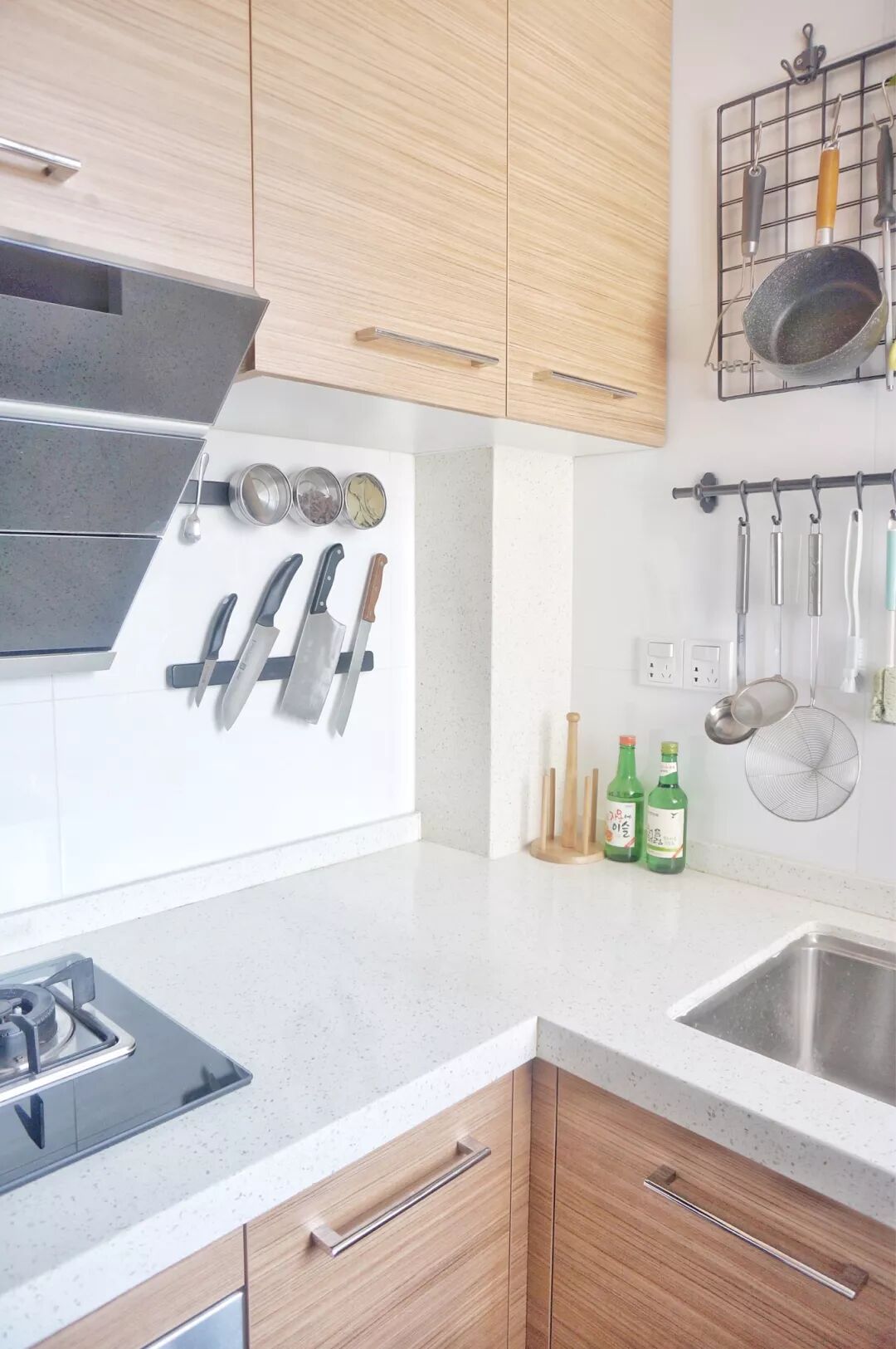 墙上以磁力刀架作为收纳刀具、餐具的工具,不仅节省了空间,也便于取放,还很有特色。