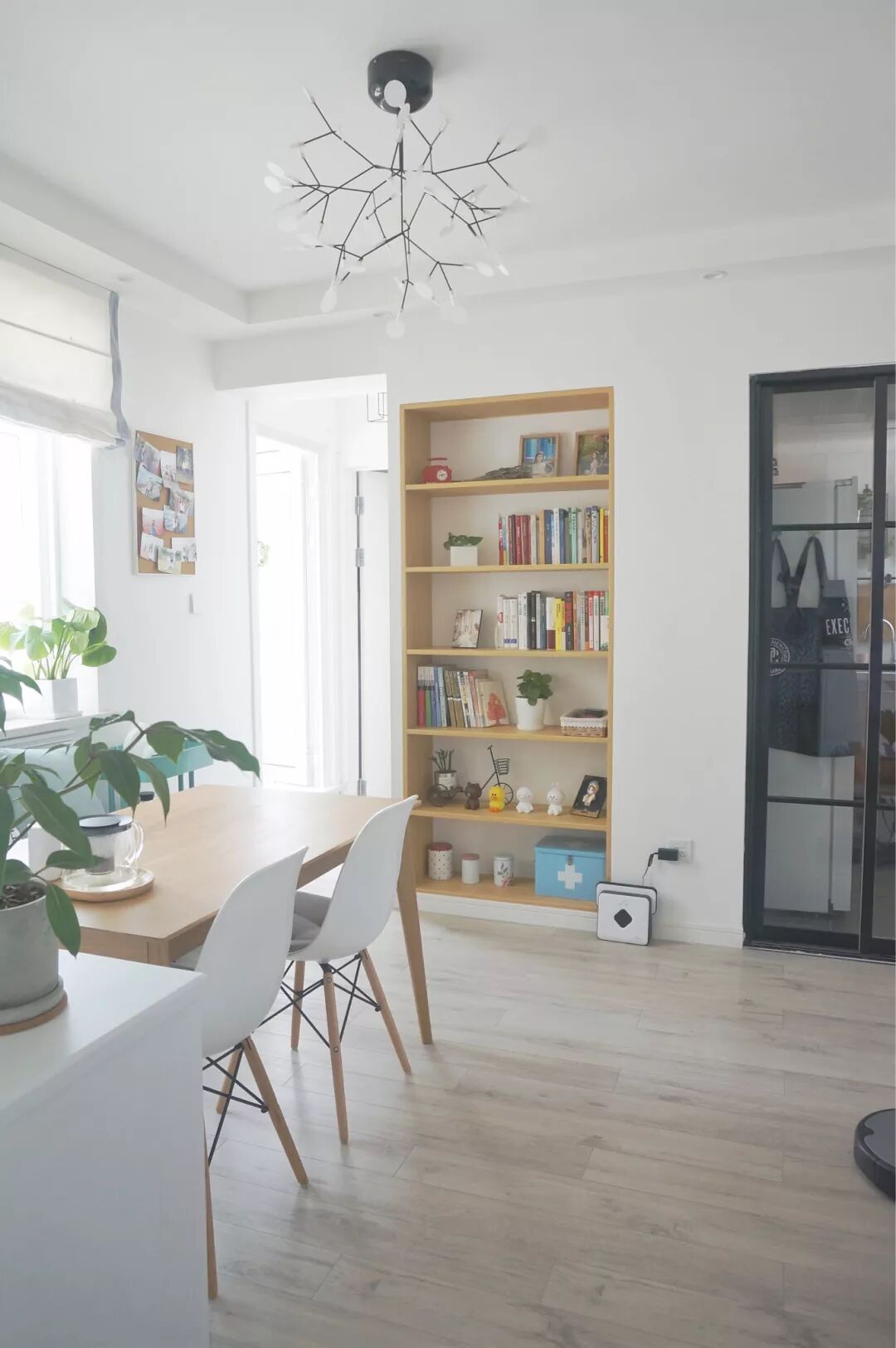墙面定制的入墙式书架,用来搁置各类书籍、家庭医药箱、绿色盆栽、小饰物等,美观又实用。