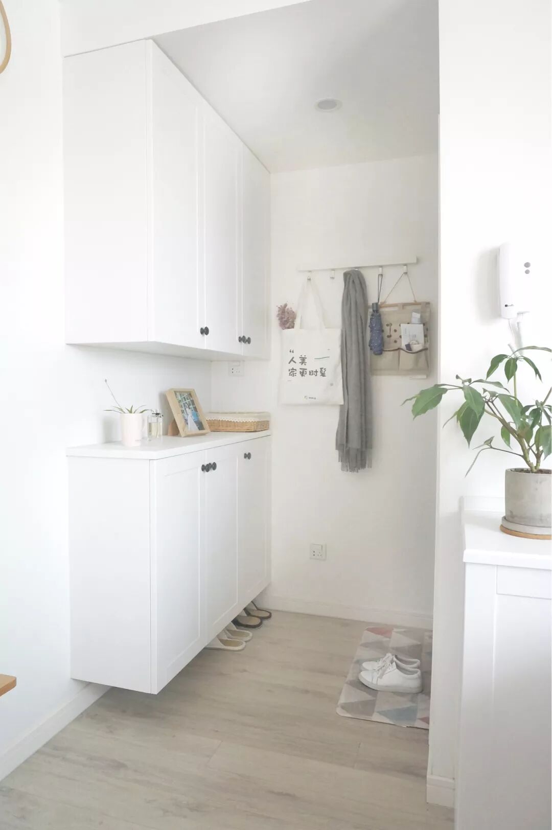 白色调为主的玄关墙面,搭配浅灰色质感的木地板,白色的定制鞋柜,三角形图案的浅彩色地毯,打造出一个干净整洁、简约舒适的玄关。
