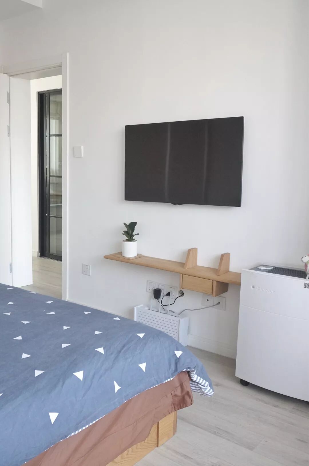 电视以挂置的方式安置在墙上,节省了占地空间。