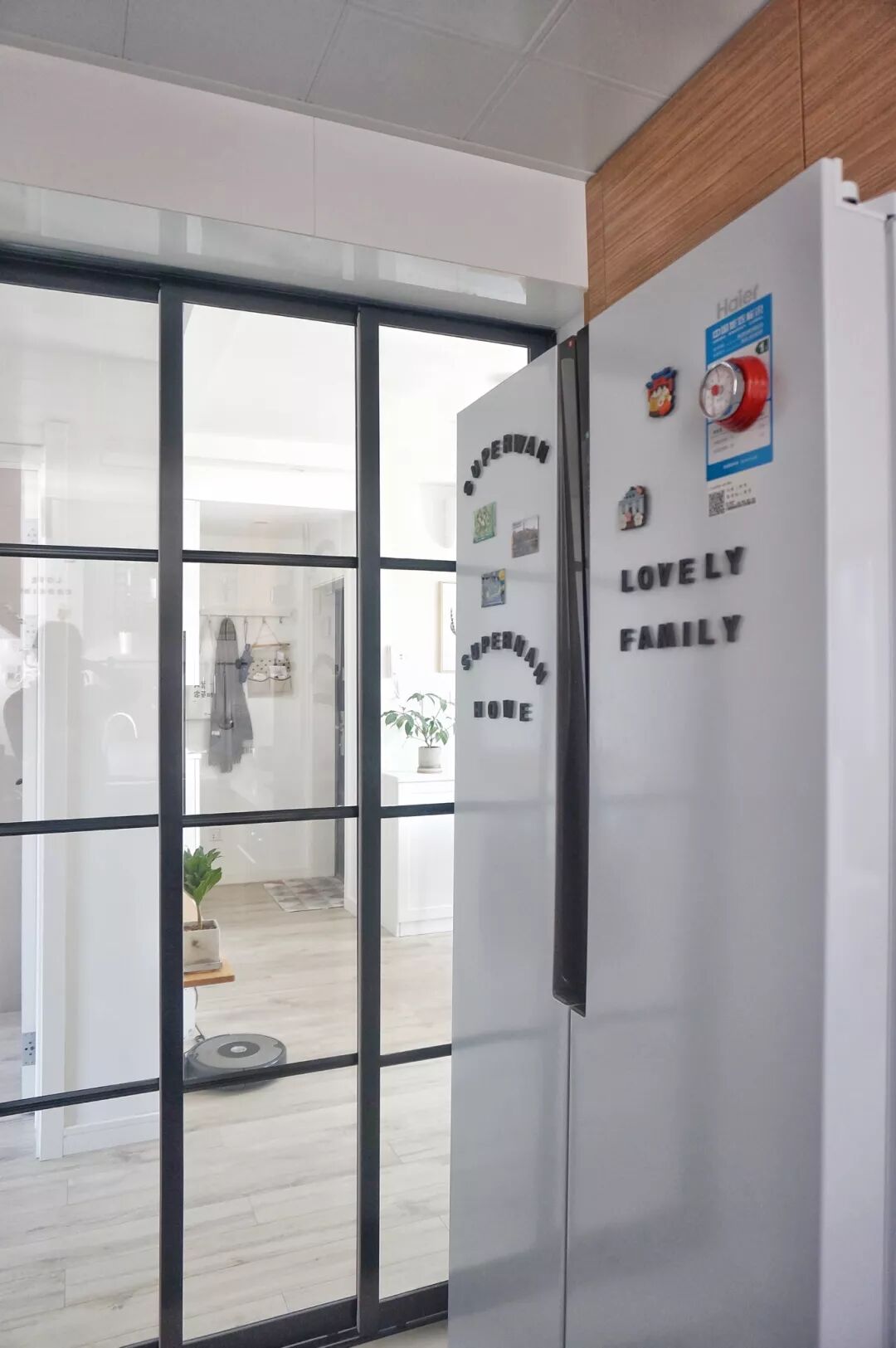双开门模式的大冰箱,足以装下了主人大大的美食梦,冰箱门上面贴着童趣的字母,结合黑色框架的推拉门,让厨房充满小清新的文艺气息。