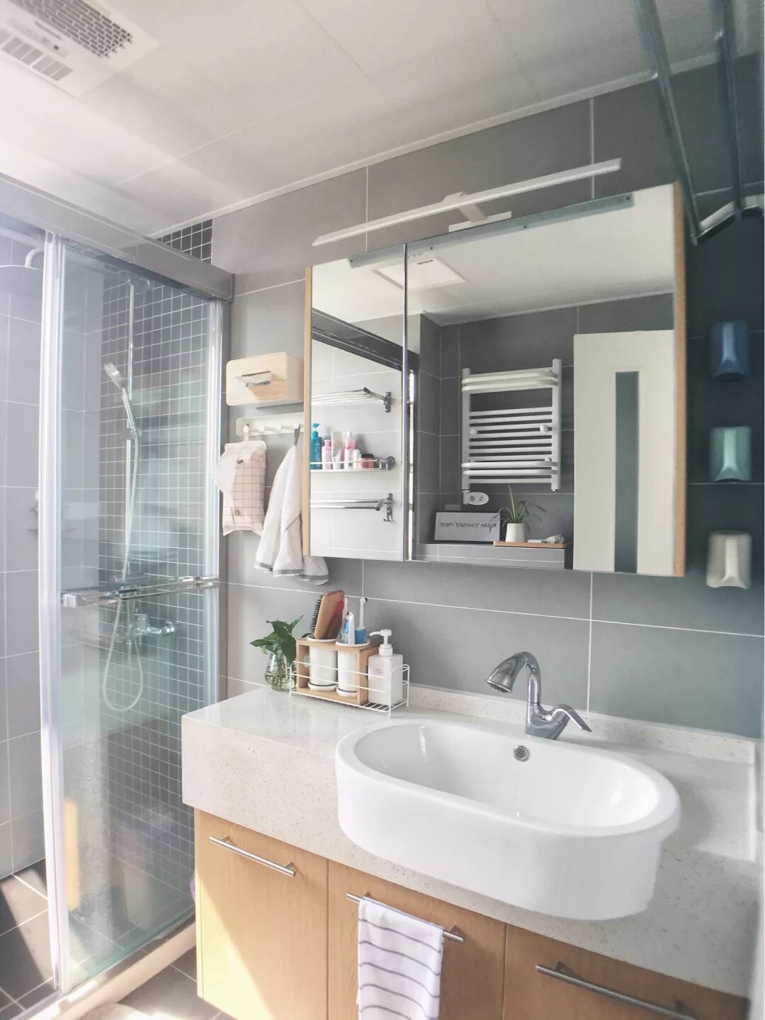 椭圆形盥洗池半悬挂的设计方式,而错落有致的收纳与小饰品,也是让小卫生间更加自然轻松,独特且不失美观。