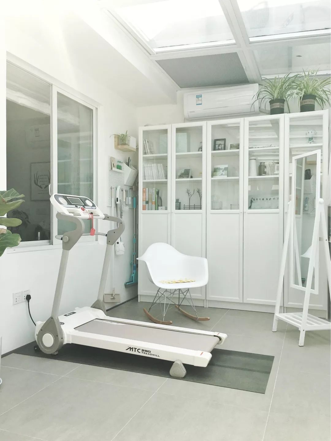 阳台还安放了一台跑步机,晨起的时候来点运动,提高了主人的生活质量,为主人的健康起架护航。运动过后,也可从橱窗里取一书,安静地窝在摇椅里细细品读。