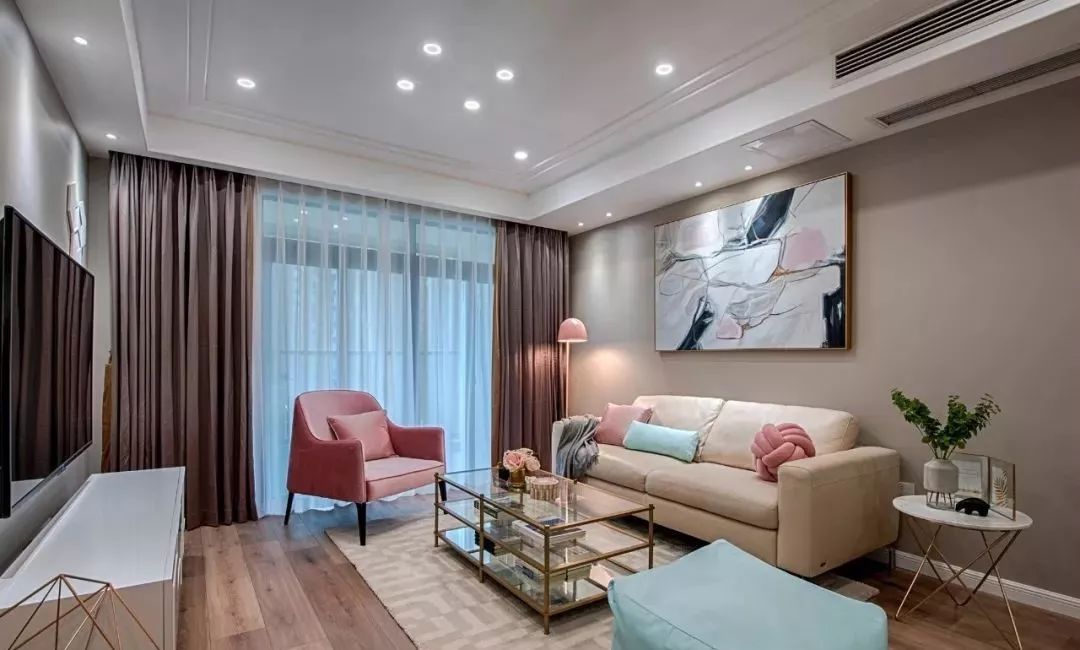 ▲ 客厅地面通铺木质地板,简约天花无主灯设计,巧克力色窗帘,沉稳中给人一丝甜蜜感