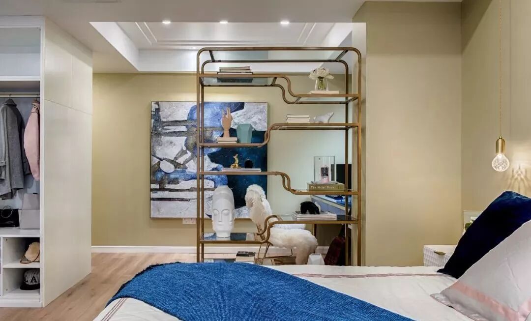 ▲ 金边蓝色书桌融合了抽象画与铁件隔断中的色调与质感,让空间保持风格统一