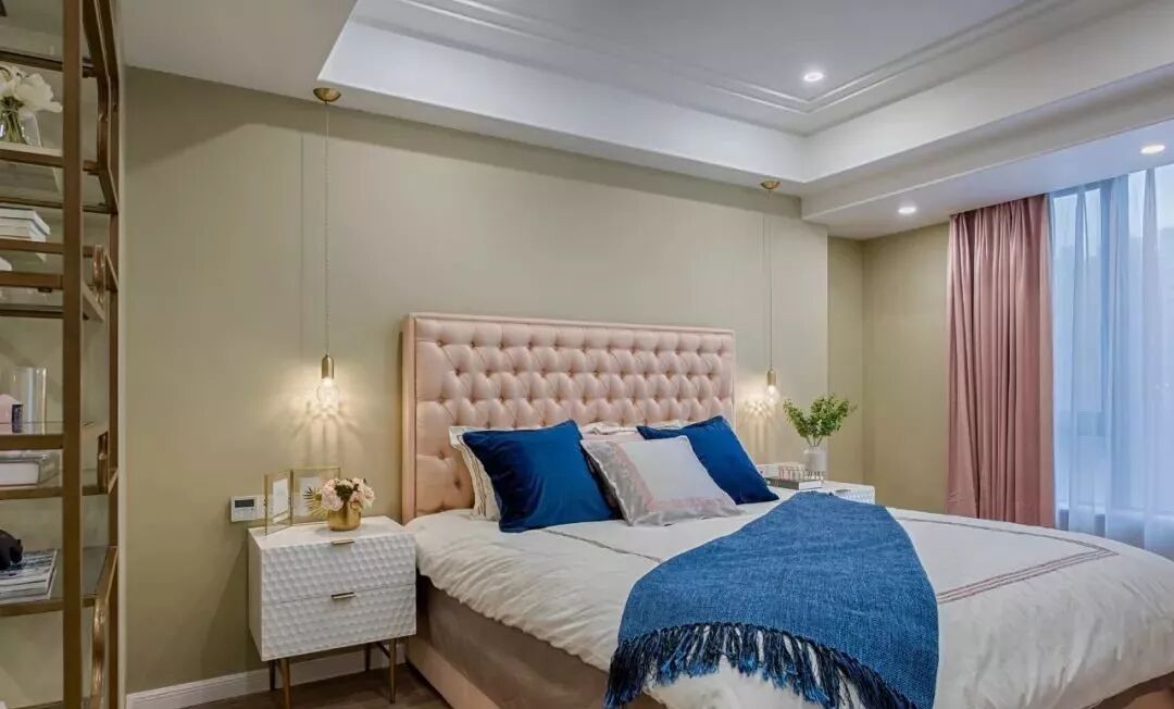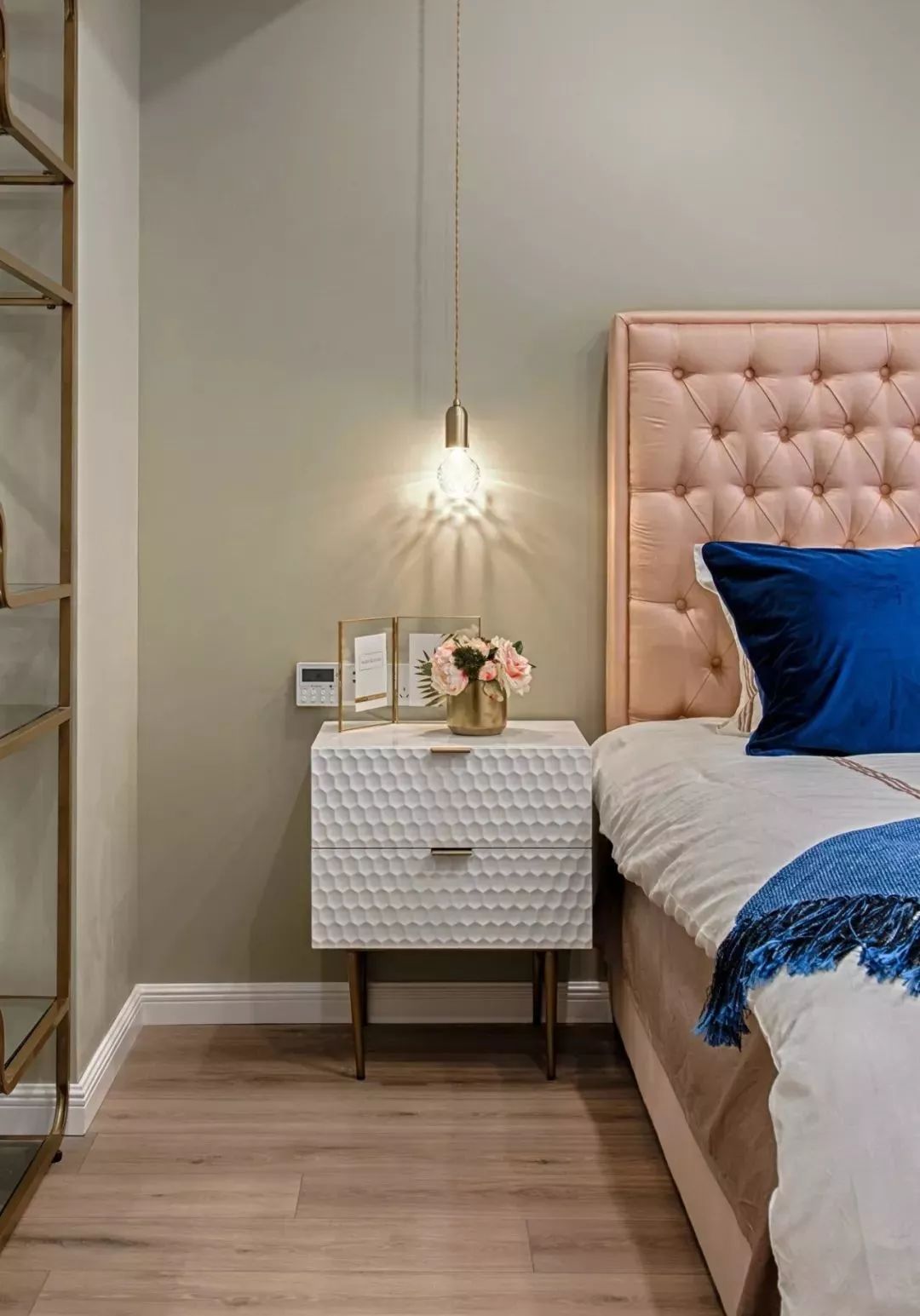 ▲ 主卧木色地板,芥末浅绿墙面,深浅粉色大床与窗帘搭配白色床头柜,对称悬空吊灯,精致美观