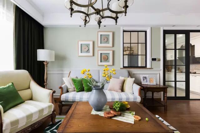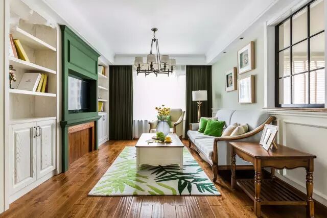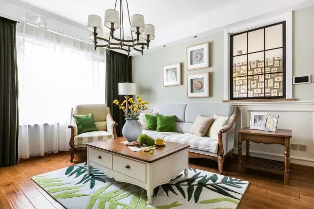 ▲ 转向客厅,映入眼帘的是深深浅浅的绿色。绿色的背景墙、窗帘、抱枕、地毯,让人的心情瞬间放松,感觉空气都变得清新了。家具选用优雅大方的美式风格,搭配木色的地板,又让空间多了些复古和安逸的感觉。