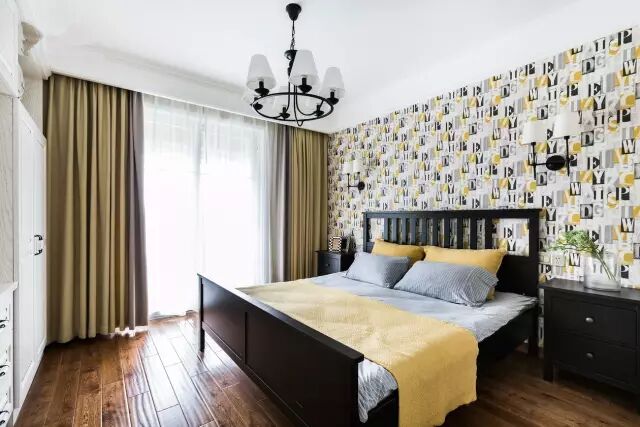 ▲ 次卧的色调相比主卧就显得清新很多。黄灰色搭配的字母壁纸,活泼可爱,搭配相同色系的床品和窗帘,让整个空间协调统一。