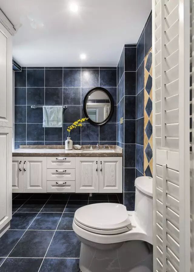 ▲ 洗手间位于玄关的左侧,外面有单独的洗手台,里面是完整的卫生间,装修风格非常吸引人的眼球。颜色上选用了一种不太常见的深海蓝色,细看还夹杂着浅色的花纹,特别漂亮。除了满足日常的需求外,还做了好多收纳柜,收纳能力超强。