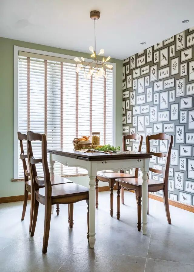 ▲ 旁边的餐厅主要以绿色为主,大大的窗户将自然光引入室内,照在绿色的墙纸上,略带一种复古怀旧的美感。