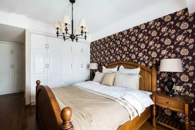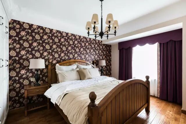 ▲ 主卧以紫色为主,紫色碎花壁纸搭配紫色的窗帘,空气中都弥漫着高贵和神秘的气息。木色的美式大床上选用干净的米色床品,点亮空间色彩,不至于让卧室的颜色显得那么暗沉。