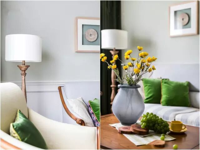 ▲ 浅色的布艺沙发感觉单调,放上几个绿色的抱枕,再铺一块植物地毯,瞬间让客厅充满生机。注意看沙发背后,石膏线打造的护墙板,是不是很美式,很好看?!