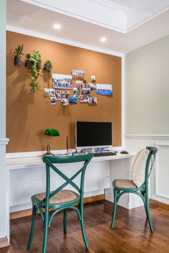 ▲ 原先与客厅相连的餐厅区域被改成了书房,很好的增强了互动性。绿色的靠椅和土黄色的墙面点亮了空间色彩,墙上挂几盆小绿植,粘几张照片,让整个家充满清新的自然味道。