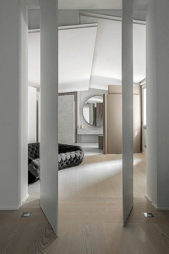 将门完全隐形于一堵轻体墙中,可以营造特定的空间氛围。门与墙壁融合成为一个统一的整体,还可以起到延伸空间的作用。