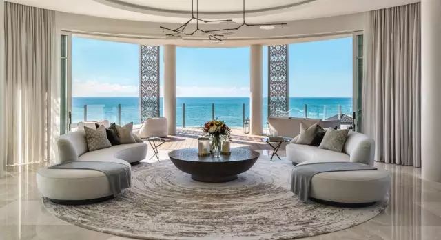 不要觉得弧形沙发很前卫,其实是1950年代的设计,弯曲的形状让空间更加灵动,布置在大开间的客厅中带有围和感。