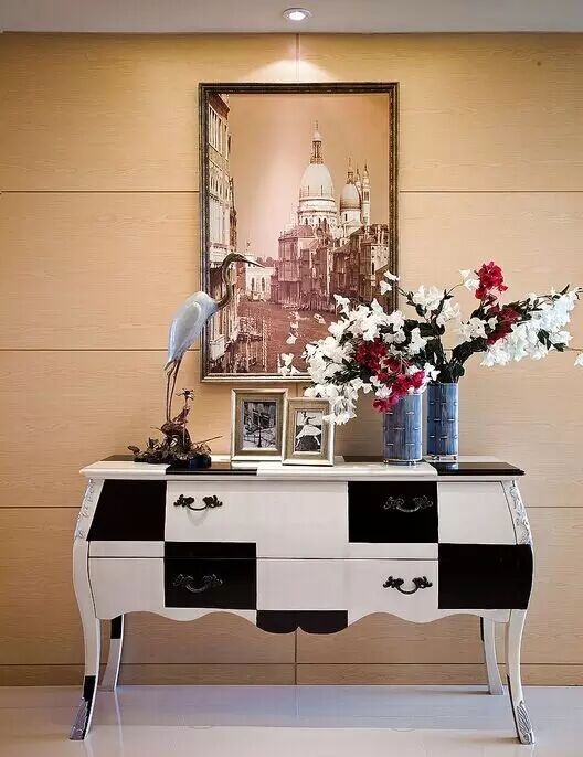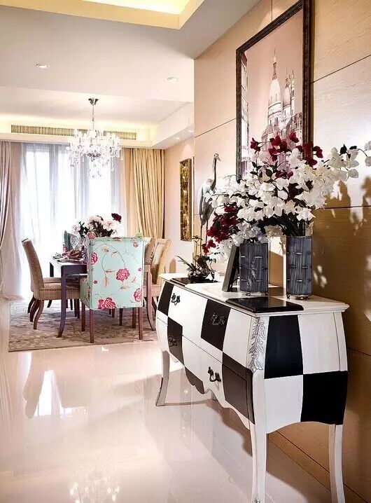 进门玄关,一个法式黑白格鞋柜,首先映射出了空间后现代的时尚气息。