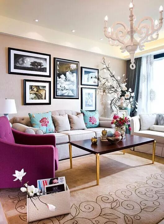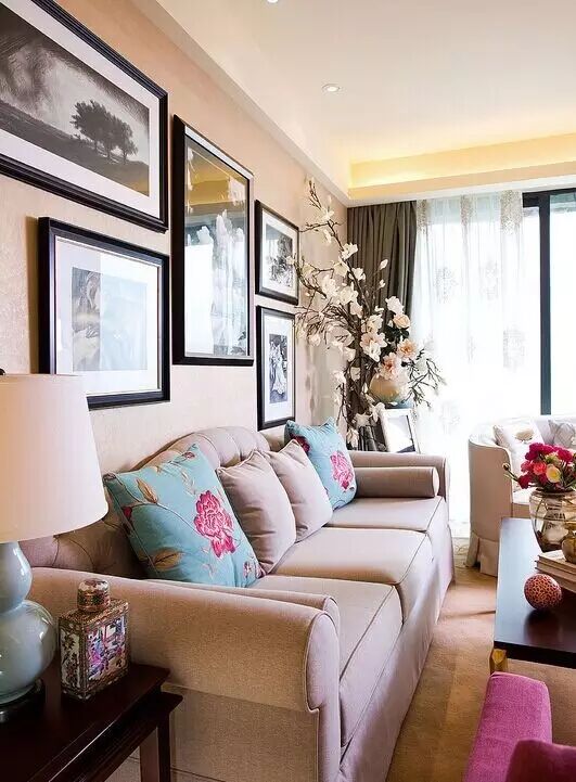 客厅中,除了米白色作为主色调外,设计师通过沙发、抱枕和花艺的色彩运用,让“湖蓝”与“桃红”这两种极具冲击力的颜色同时出现,带来强大的视觉张力。