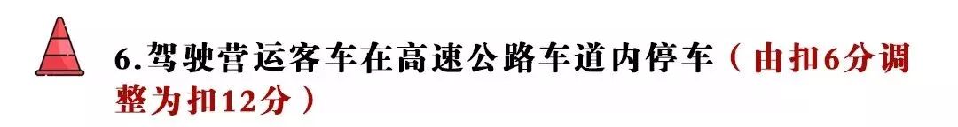 连续驾驶中型以上载客汽车、危险物品运输车辆超过4小时未停车休息或者停车休息时间少于20分钟(由扣6分调整为扣12分)