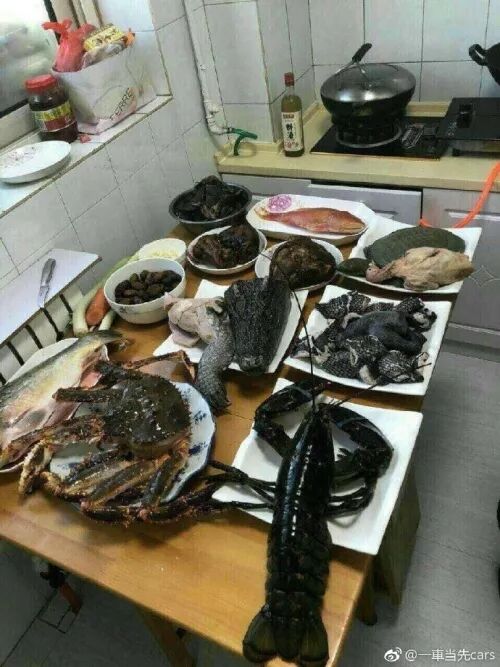 配图显示,桌面上,砧板上,菜篮子,水池子里,摆满了保护动物……