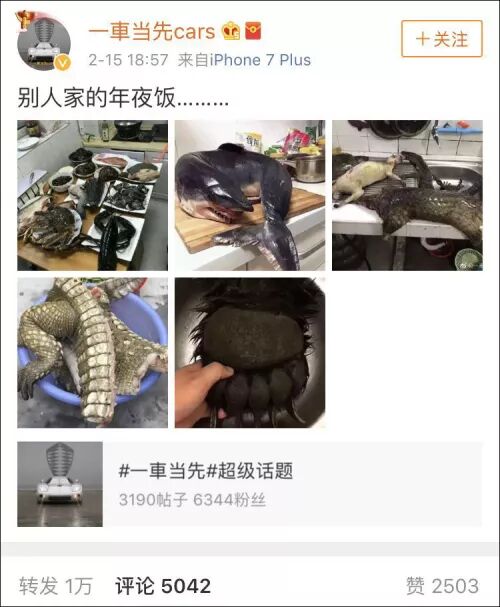 除夕下午7点左右,用户@一車当先cars 发布了一条微博,称是“别人家的年夜饭……”