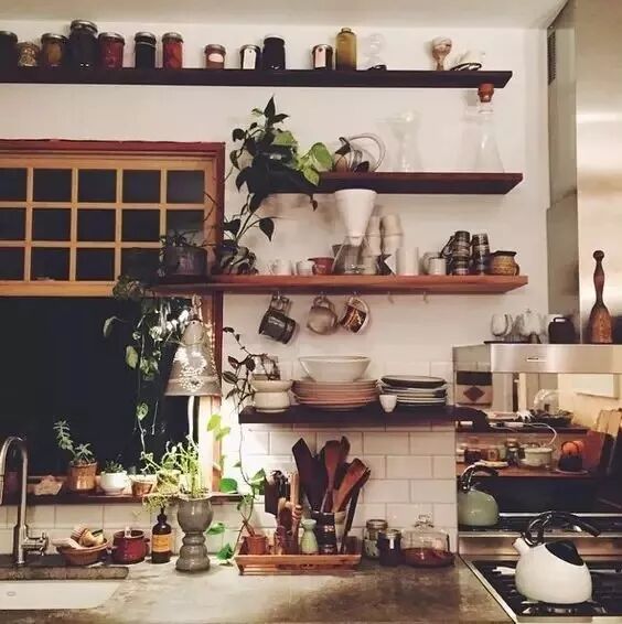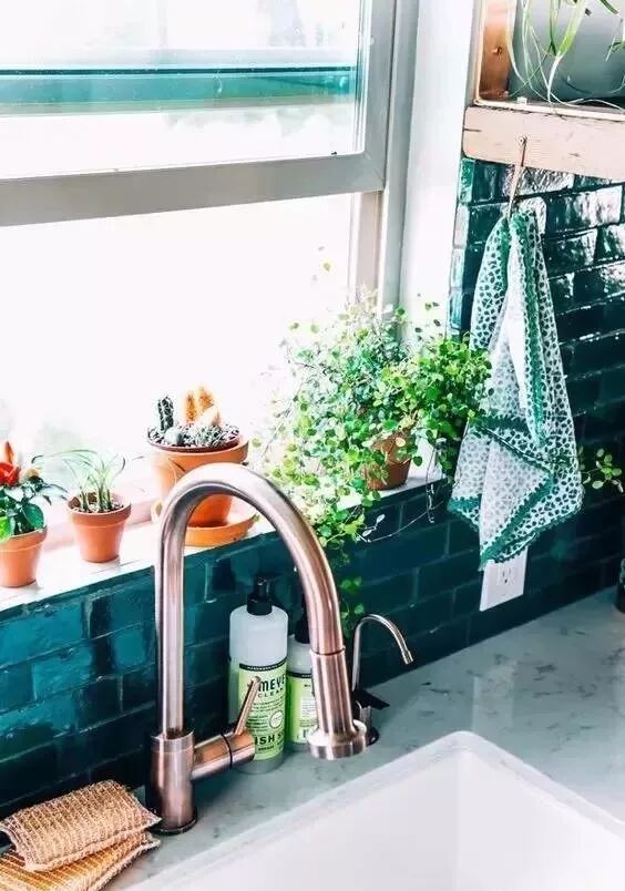 一个充满绿植的厨房,简直满足了对梦想中厨房所有的幻想啊。厨房是油烟重地,温度变化也较大,可以选择一些适应性强的小型植物。