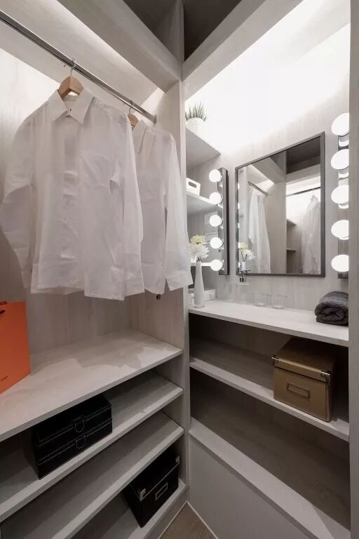 于夹缝处装设推拉式全身穿衣镜,内部则是精致的梳妆台。
