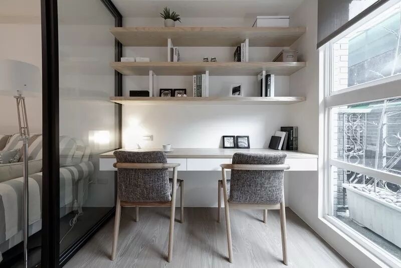 书房与卧室相连,白色钢制清透玻璃窗落地窗,清新透亮。