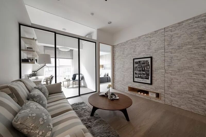 客厅的电视主墙结合储物间的隐藏门片,外观使用仿石砌文化石墙面做美化装置。