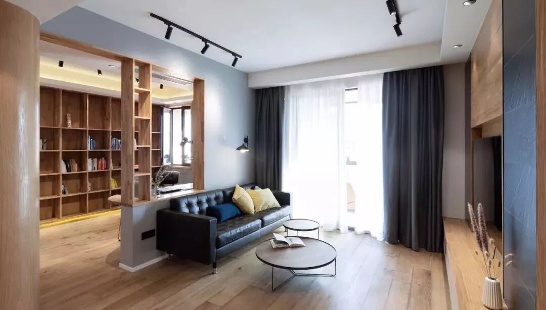 ▲ 客厅地面延续木质地板铺贴,整体以黑白灰为基调,并辅以大面积原木,增添空间质感