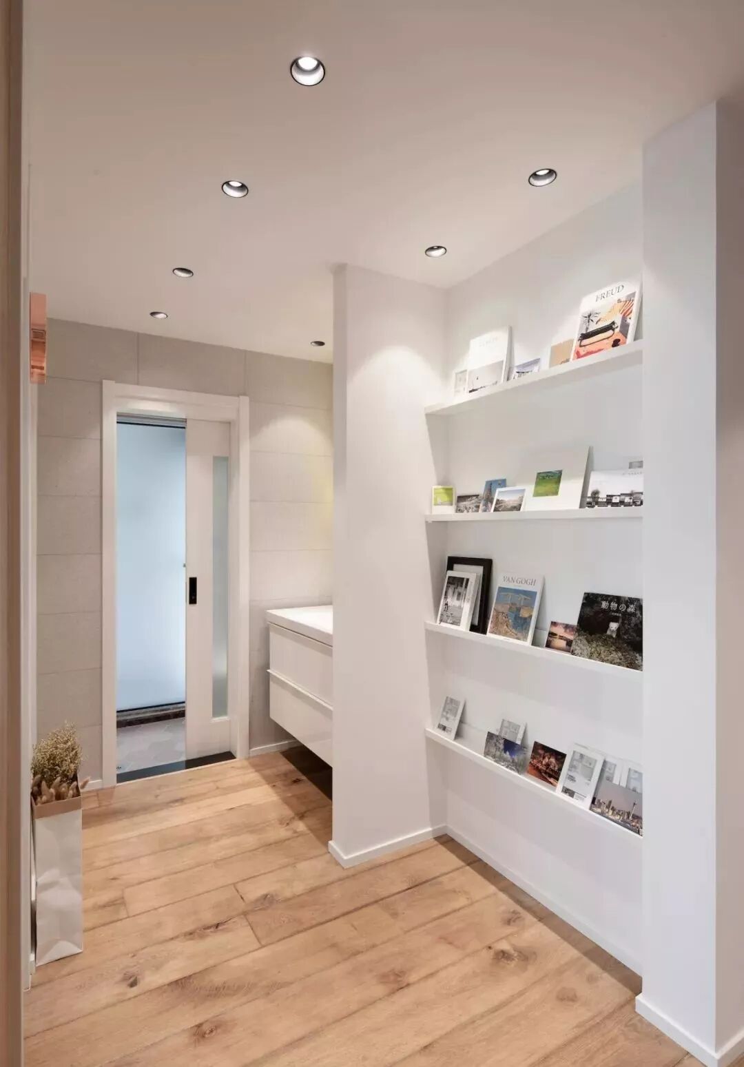 ▲ 利用后砌玄关隔墙,将背景设计成读物展示区,简单的设计增添公领域使用机能