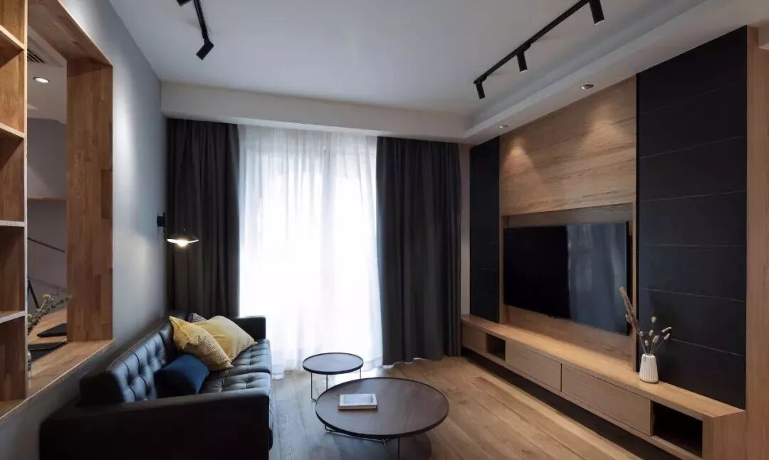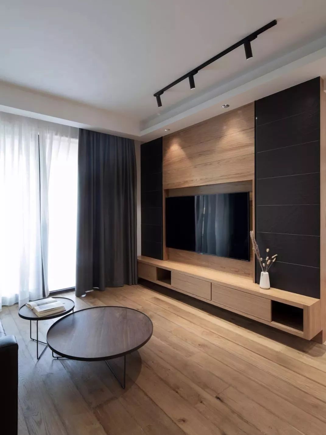 ▲ 电视背景墙采用木面结合黑色丝绸纹理砖,对称铺贴出简约造型,下方一字形悬空电视柜,让空间打扫不留死角