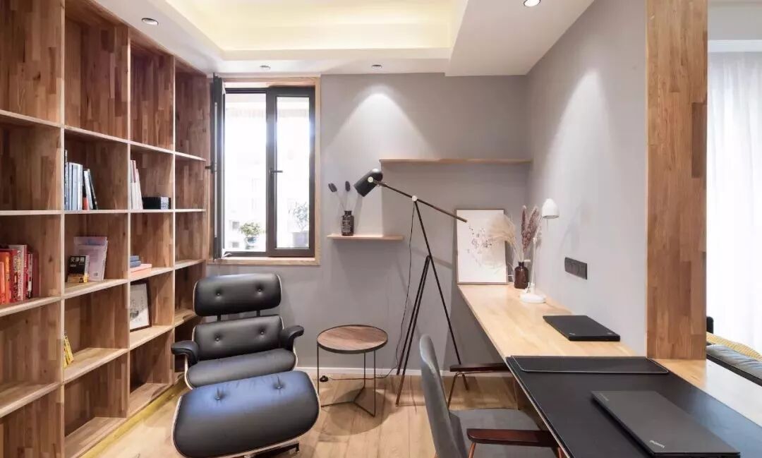 ▲ 书房大面积原木家具,搭配黑色乳胶漆墙面,“伊姆斯”阅读角,底部架空书架墙,提升整个空间文化氛围