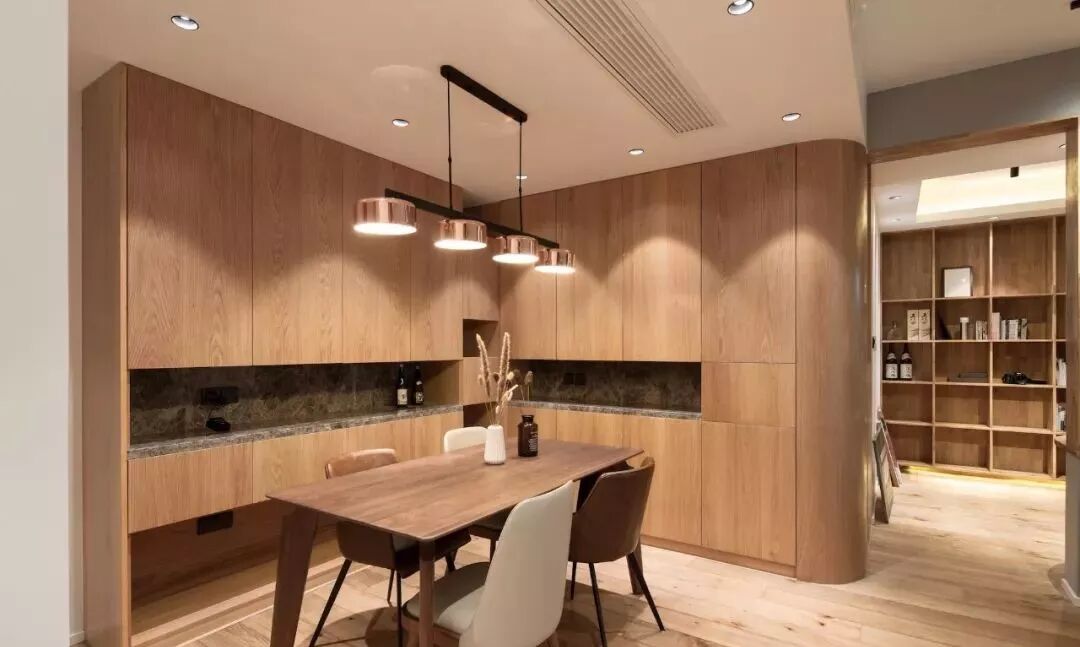 ▲ 木作转角柜体墙,中部留空以爱马仕灰系石材收口,提供室内大容量储物机能,并兼作餐厅背景使用