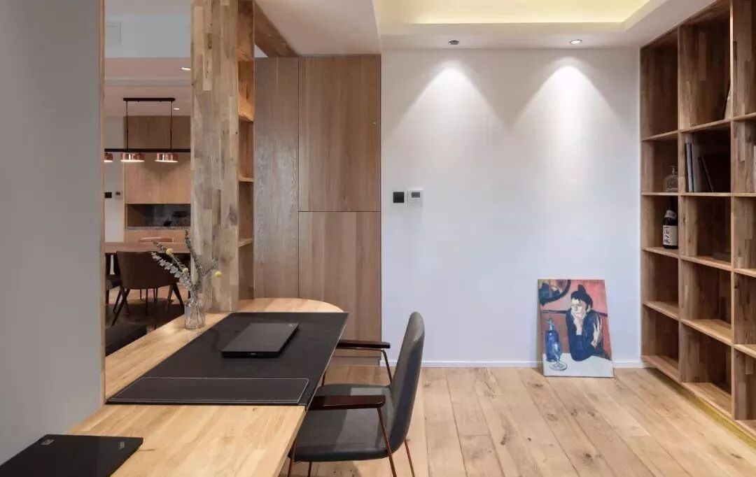 ▲ 由整块橡木指接板打造出30mm厚的办公桌,转角做大弧度切割打磨,让书房与餐厅间的弧度形成“双曲线”流动空间