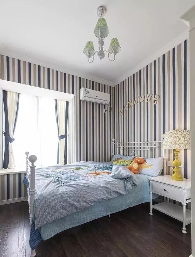 儿童房看上去充满了童趣,条纹墙纸,草绿吊灯,美式风情的铁艺床,还有可爱的床品,搭配起来非常和谐,使房间显得明亮而灵动。